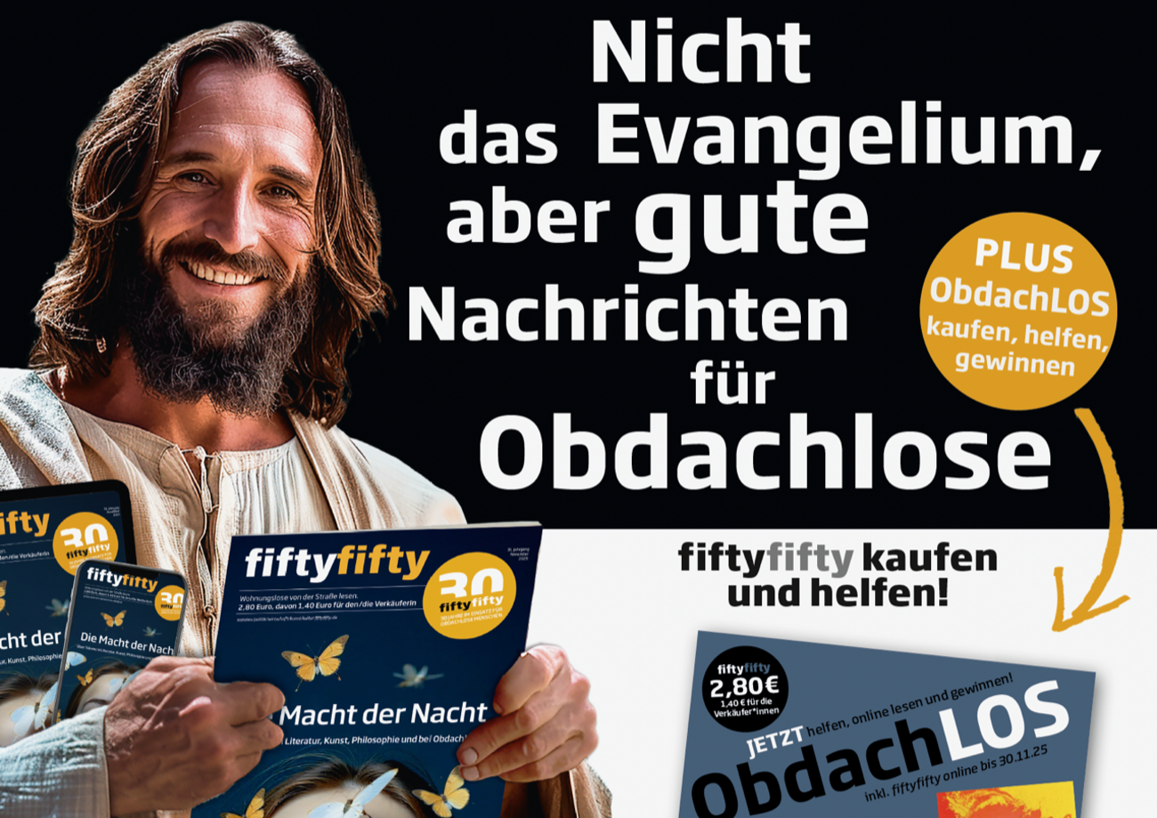 Aufmerksamkeitsstarke Werbung: Erst Helge Schneider, dann Christian Ehring - nun kein Geringerer als Jesus. Um dem Auflagenschwund bei fiftyfifty entgegen zu wirken, haben wir zusammen mit unserer Agentur d-a-n-k-e.com wieder eine Kampagne für Social Media und für Plakatwände in Düsseldorf erstellt. Das Digital-Abo zur Rettung von fiftyfifty gibt es ab 38 Euro/Jahr hier.