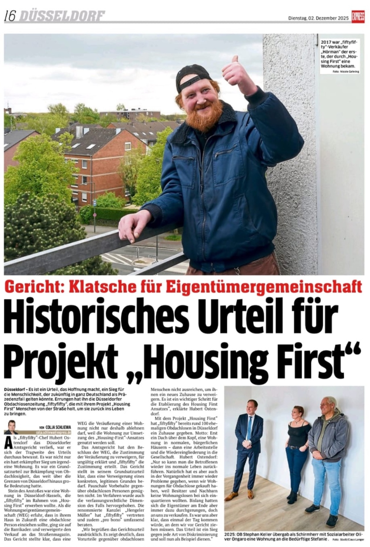 Mit dem Projekt „Housing First“ hat „fiftyfifty“ bereits rund 100 ehemaligen Obdachlosen in Düsseldorf ein Zuhause gegeben. Motto: Erst ein Dach über dem Kopf, eine Wohnung in normalen, bürgerlichen Häusern – dann eine Arbeitsstelle und die Wiedereingliederung in die Gesellschaft. Hubert Ostendorf: „Nur so kann man die Betroffenen wieder ins normale Leben zurückführen. Natürlich hat es aber auch in der Vergangenheit immer wieder Probleme gegeben, wenn wir Wohnungen für Obdachlose gekauft haben, weil Besitzer und Nachbarn keine Wohnungslosen bei sich einquartieren wollten. Bislang hatten sich die Eigentümer am Ende aber immer dazu durchgerungen, doch an uns zu verkaufen. Es war uns aber klar, dass einmal der Tag kommen würde, an dem wir vor Gericht ziehen müssen. Das Urteil ist ein Sieg gegen jede Art von Diskriminierung und soll nun als Beispiel dienen.“ COLJA SCHLIEWACOLJA, EXPRESS
