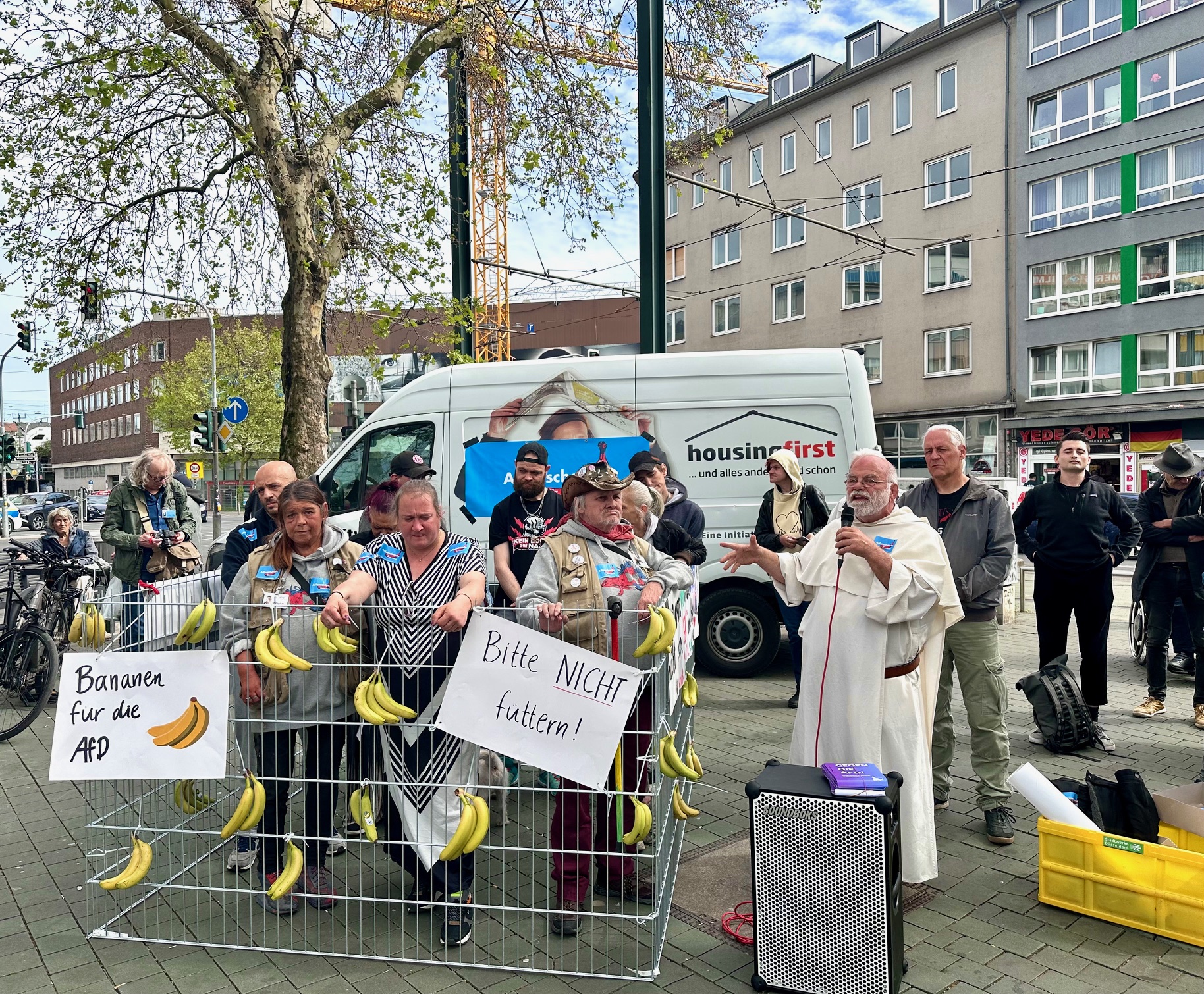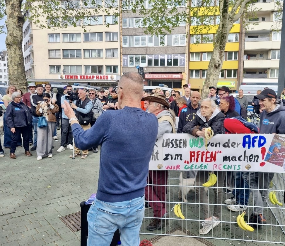 "Bitte nicht füttern" stand auf dem Käfig, den die fiftyfifty-Verkäufer*innen am Worringer Platz aufgestellt hatten. Mit ihrem "Freiluftgehege" protestierten die Obdachlosen gegen den Besuch der rechtsextremen brandenburgischen Landtagsabgeordneten Lena Kontré. Weil die AfD-Politikerin diese am liebsten wie die Tiere wegsprerren möchte, hatten die Verkäufer*innen des Düsseldorfer Straßenmagazins etwas mitgebracht und verteilten aus ihrem Käfig heraus Bananen. Motto: "Wir lassen uns nicht zum Affen machen." Oder, wie es auf 5.000 Aufklebern und einem Transparent zu lesen gab: Die AfD ist eine "Affenschande für Deutschland". ... Im Düsseldorfer Bahnhofsumfeld hat sich die AfD für Vertreibung und die Einkasernierung von Obdachlosen ausgesprochen. ... fiftyfifty-Chef Hubert Ostendorf: "Die AfD will sich hier nicht über Armut informieren. Sie will voller Verachtung auf sie herunterblicken. Auch im Dritten Reich wurden Arbeistlose einkaserniert und in Lager gesteckt, wo viele ermordet wurden." Colja Schliewa, EXPRESS