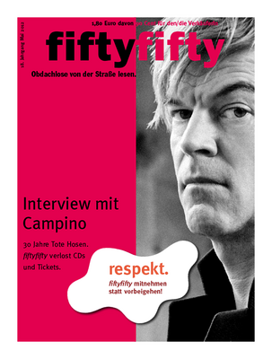 Die erste fiftyfifty erschien 1995. 1996 gab uns Tote-Hosen Gitarrist Breiti bereits sein erstes Interview. Im Jahr 2010 sprach er für ein fiftyfifty-Hörbuch den Text eines Obdachlosen ein. Sänger Campino gab den Sprecher für einen fiftyfifty-Kinospot und engagierte sich gegen die Abschiebung einer jungen Romni, die wir betreuten. Bassist Andi Meurer besuchte die Redaktion und stand für ein Interview zur Verfügung. Er schenkte uns einen signierten Bass zur Verlosung und, zusammen mit seiner Frau Carla, die unzählige Tourneefotos geschossen hat, eine von allen Bandmitgliedern unterschriebene Großaufnahme und später drei weitere im kleineren Format zum Verkauf in unserer Galerie. Zudem gab es begehrte Promo-CDs, die eigentlich nur für den Rundfunk angefertigt werden, T-Shirts und Einladungen zu Konzerten als Verlosungstickets für unsere Leser*innen. Sogar den Hosen-Song „Steh‘ auf, wenn du am Boden liegst“ durften wir für einen Kinospot zugunsten unseres russischen Straßenkinderzirkus „Upsala“ verwenden. Und auf ihrer Facebook-Seite unterstützten die Hosen ein Voting zum besten Plakat des Jahres, indem sie dazu aufforderten, für unseren Entwurf abzustimmen. Nur dadurch haben wir den Wettbewerb und das Preisgeld – 50.000 Euro für die Obdachlosenhilfe – gewonnen. Neulich erst hat Breiti stellvertretend für die ganze Band mit einigen fiftyfifty-Zeitungen in der Hand auf Facebook Werbung für unser Digital-Abo gemacht. Als Aldi allen fiftyfifty-Verkäufer*innen den Zutritt zu sämtlichen Marktgeländen verwehrte, sagte er vor laufenden Kameras und Mikrofonen mutig, dass dies nicht fair sei. Später nahm er an einem alternativen Stadtrundgang von Obdachlosen (strassenleben.org) unter großer Medienpräsenz teil. Drummer Vom Ritschie hat anlässlich einer Ausstellung mit Fotos von Obdachlosen in unserer Galerie als DJ Musik aufgelegt und mit seiner Beteiligung dafür gesorgt, dass der Abend sehr gut besucht war. Zudem gab uns auch Vom ein großartiges Interview.