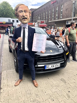 Spektakuläre Aktion der Straßenzeitung fiftyfifty vor dem Düsseldorfer Hauptbahnhof. Die Gestalt von Bundesfinanzminister Christian Lindner fährt stilecht im Porsche vor, in der Hand einen Schildpanzer mit dem Logo der Nobelmarke und der Aufschrift entsprechend seiner vielfach geäußerten Statements: „9-Euro-Ticket NO, Tankrabatt YES“. In der anderen Hand ein Kanister mit den Buchstaben seiner Partei „FDP“ und mitgelieferter Deutung: „Für den Porsche“. Ziel dieser von Farbfieber-Künstler Klaus Klinger umgesetzten Inszenierung ist es, Aufmerksamkeit zu erzeugen, für das, was Obdachlose vortragen, nämlich: Warum das 9-Euro-Ticket aus ihrer Sicht nach drei Monaten nicht abgeschafft werden darf. Viele berichten darüber, wie sie erstmalig seit langer Zeit wieder den Luxus der Mobilität erleben durften, wie sie in ferne Städte gefahren sind, ohne Angst, bei Schwarzfahren erwischt zu werden. Denn gerade Obdachlose können sich oft nicht einmal das fast 40 Euro teure Sozialticket leisten und werden wegen wiederholter Beförderungserschleichung am Ende inhaftiert.