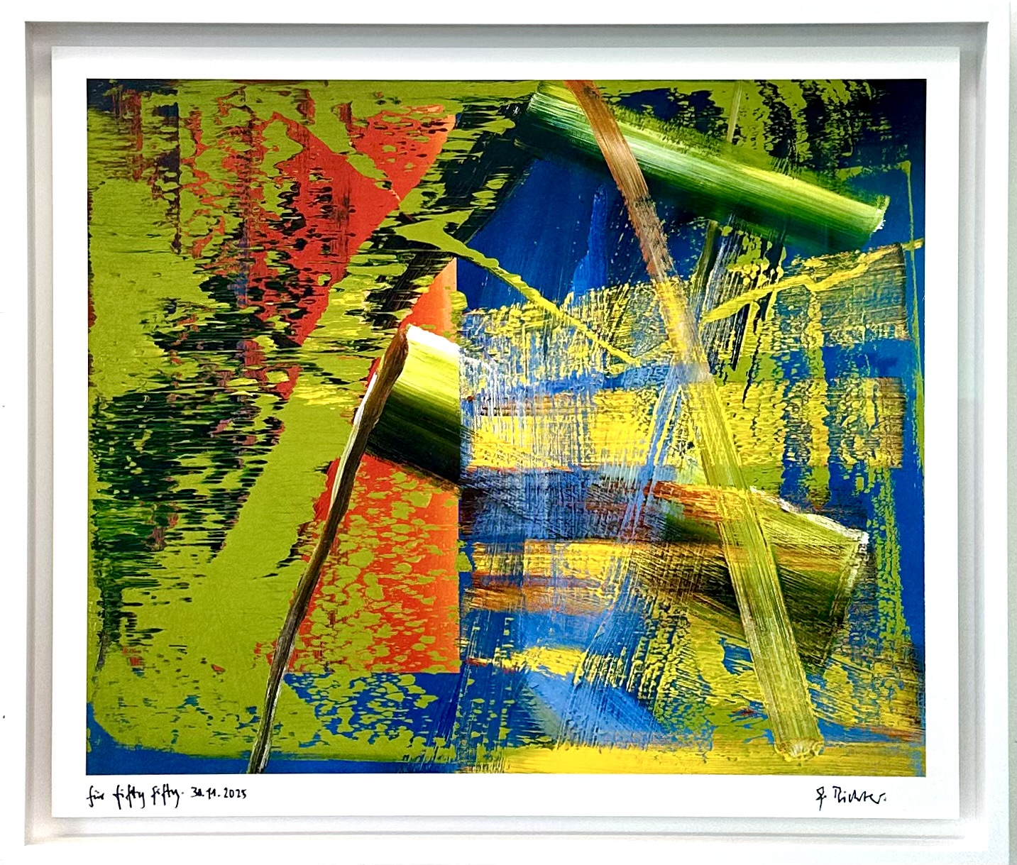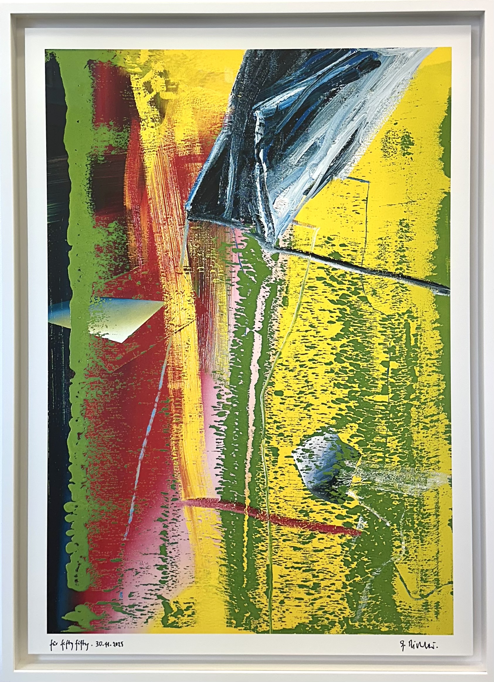 In Absprache mit Atelier Gerhard Richter aufgezogen auf Alu-Dibond, freischwebend in Objektrahmung der Rheinischen Rahmenfabrik Köln (Holzleiste mit Schleiflack matt-weiß, UV99 Acryglas, bruchsicher), Maße ca. 90 cm x 70 cm