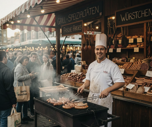 Antonio grillt Würstchen in einer Marktbude. Seine Zähne sind saniert, die Psyche gesund; eine Wohnung hat er auch, dank fiftyfifty und Housing First. Die Zeit der Obdachlosigkeit ist vorbei. (Foto: Gemini)