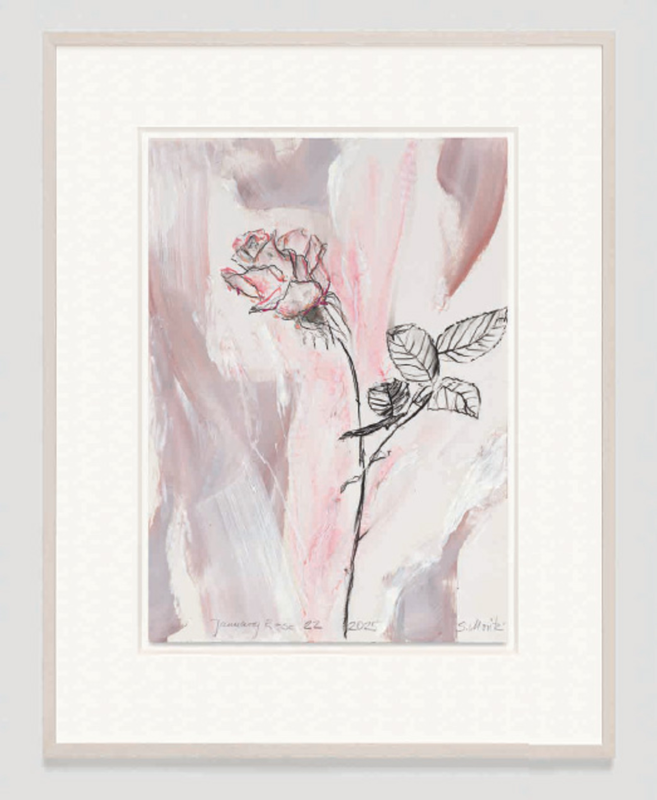 Die Serie January Roses von Sabine Moritz (*1969 in Quedlinburg) entstand als Unikat-Edition eigens für die Obdachlosenhilfe der fiftyfifty-Galerie im Januar 2025 und umfasst 50 Originale. Für Obdachlose stellt der Winter eine besondere Herausforderung dar, da Kälte und widrige Umstände besonders drückend sind. Mit der Arbeit möchte Moritz daran erinnern und gleichzeitig Hoffnung und Schönheit vermitteln.