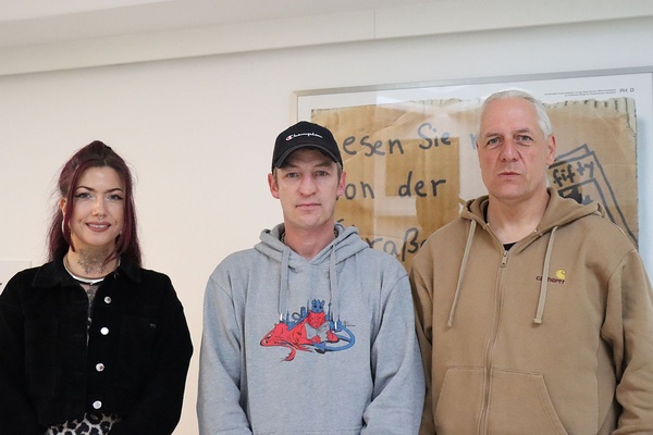 fiftyfifty-Sozialarbeiterin Alena Hansen und Streetworker Oliver Ongaro freuen sich, dass Krzysztof Glinkowski (Mitte) eine Haftstrafe erspart bleibt. (Foto: dorf-aktuell.de)