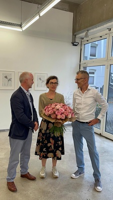 Sabine Moritz mit Felix Krämer (li) und Hubert Ostendorf bei der Eröffnung ihrer Ausstellung in der fiftyfifty-Galerie. (Foto: Amal Montasir)